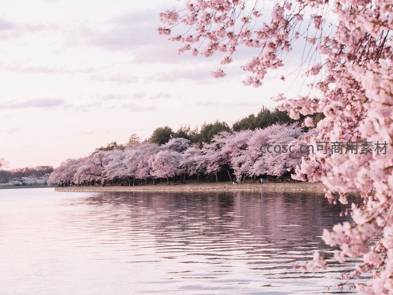 湖畔樱花如云霞倒映水中春意盎然