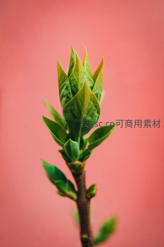 一株新生嫩芽在纯色粉红背景下向上伸展,叶片鲜绿饱满,象征着希望与成长,构图简洁却充满视觉冲击力和自然韵律。