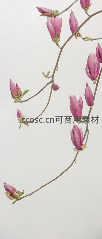一枝玉兰花在纯净背景下绽放,粉紫色花苞饱满欲滴,嫩绿新芽点缀其间,传递出春天即将到来的清新与优雅气息。