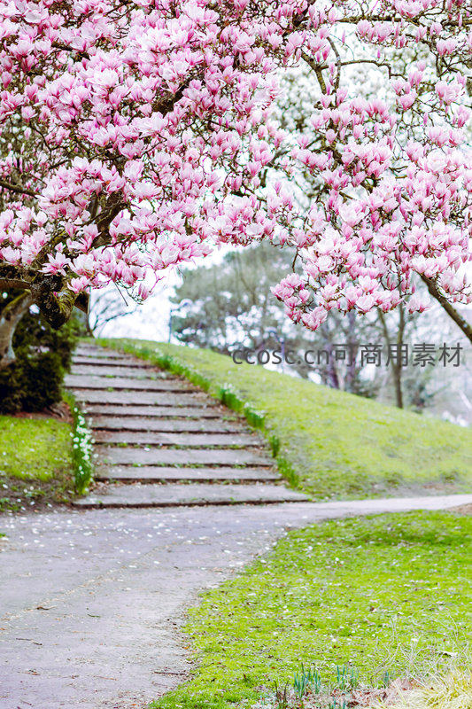 一棵盛放的玉兰树下,一条石阶小径蜿蜒向上,四周绿草如茵,落英缤纷,营造出宁静而浪漫的春日漫步氛围。
