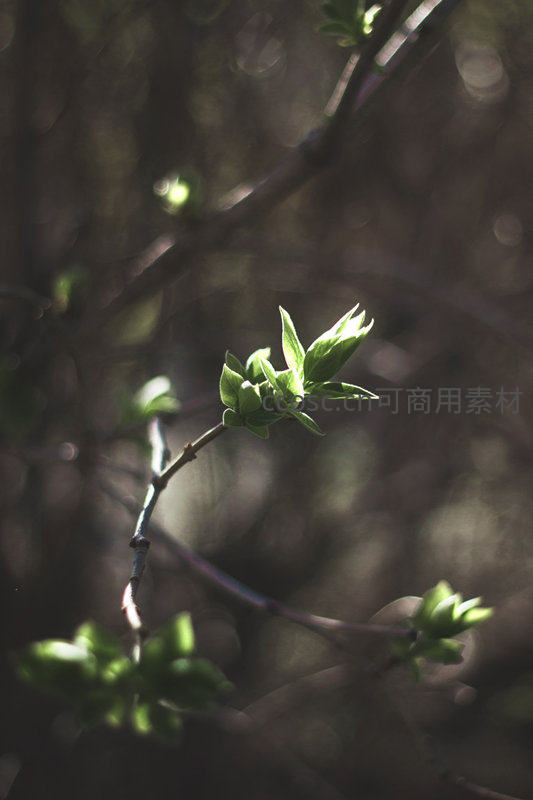 在幽暗的林间背景下,一簇簇鲜嫩的绿芽从枯枝上顽强萌发,被一束穿透的光线照亮,象征着生命在沉寂后迸发的无限活力。