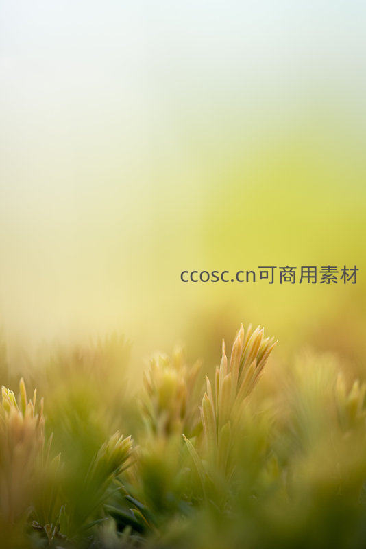 清晨阳光透过薄雾洒在草尖,微距拍摄捕捉到叶片柔软的质感和温暖的色调,营造出如梦似幻、宁静治愈的视觉体验。