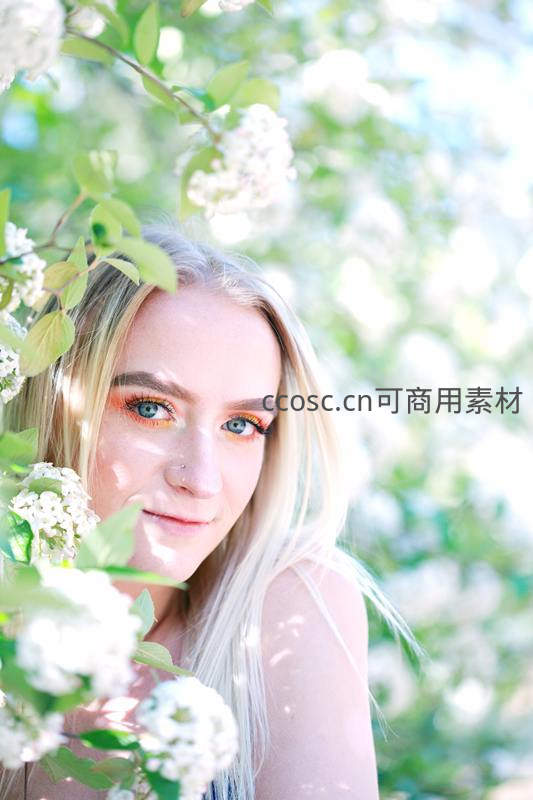 一位金发碧眼的年轻女子置身于盛开的白色花丛中,阳光透过枝叶洒下斑驳光影,她带着淡妆温柔地凝视镜头,氛围宁静而美好。