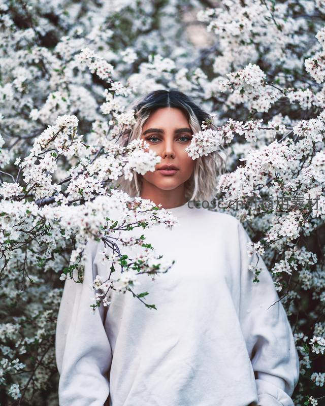 一位穿着宽松白色卫衣的女子站在盛放的樱花树前,繁密的白色花朵几乎将她环绕,营造出如梦似幻、充满诗意的春日人像画面。