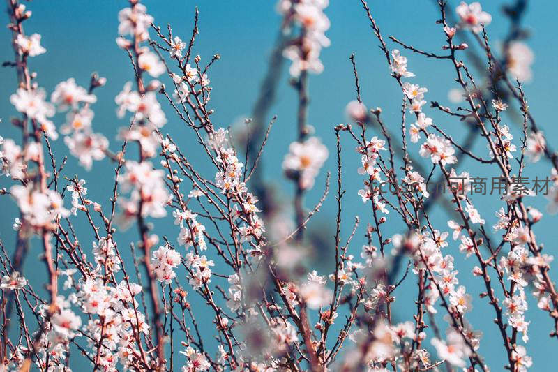 细密的杏花枝条在湛蓝天空背景下舒展,洁白花瓣点缀淡粉,光影交错间尽显生机。微距视角捕捉花蕊细节,传递出春日清新、纯净与蓬勃的生命力。