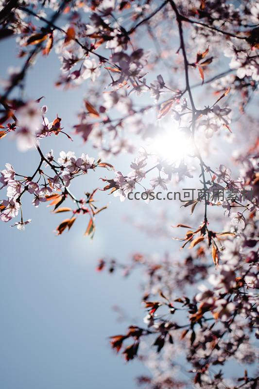 樱花枝头迎光绽放,粉瓣轻舞蓝天