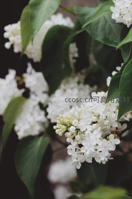 一簇簇洁白的丁香花在深绿色叶片的衬托下显得格外雅致,花瓣层层叠叠,细节清晰可见,散发着春天特有的清幽芬芳。