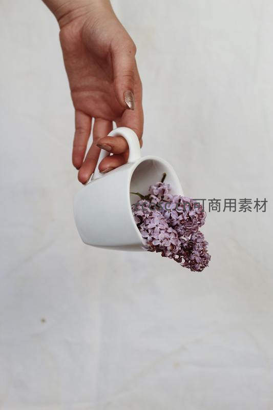 一只手优雅地握着一个倾斜的白色杯子,杯中盛放着淡紫色的丁香花,构图简洁而富有诗意。