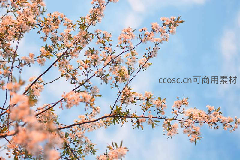 仰视视角下,粉白色的樱花在湛蓝天空的映衬下绚烂绽放,枝叶间透出春天的生机与活力。
