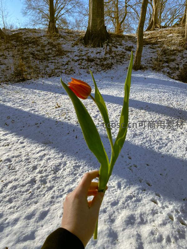 在皑皑白雪覆盖的林间,一只手持着一朵鲜艳的橙色郁金香,与背景中光秃的树木形成鲜明对比,象征着寒冬中的希望与生机。