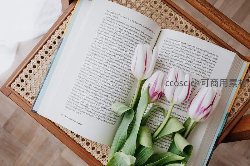 一本摊开的书籍安静地躺在藤编托盘上,几支粉白相间的郁金香温柔地倚靠在书页之间。阳光洒落,营造出充满书香与花香的惬意午后氛围。