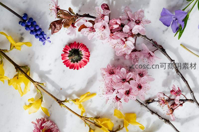 从正上方拍摄的多彩春花组合,粉色樱花、黄色连翘与紫色小花错落有致,背景为纯白大理石,呈现宁静而富有设计感的画面。