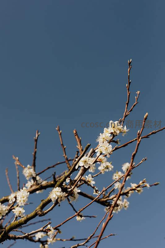 光秃的梅树枝条上绽放着洁白的小花,与纯净无云的深蓝色天空形成鲜明对比,展现了早春的生命力与宁静之美。