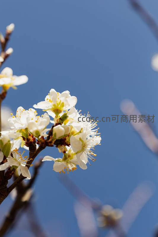 近距离捕捉到洁白花瓣与金黄色花蕊的精致细节,背景是模糊的湛蓝天空,突显了花朵的纯洁与自然的细腻纹理。