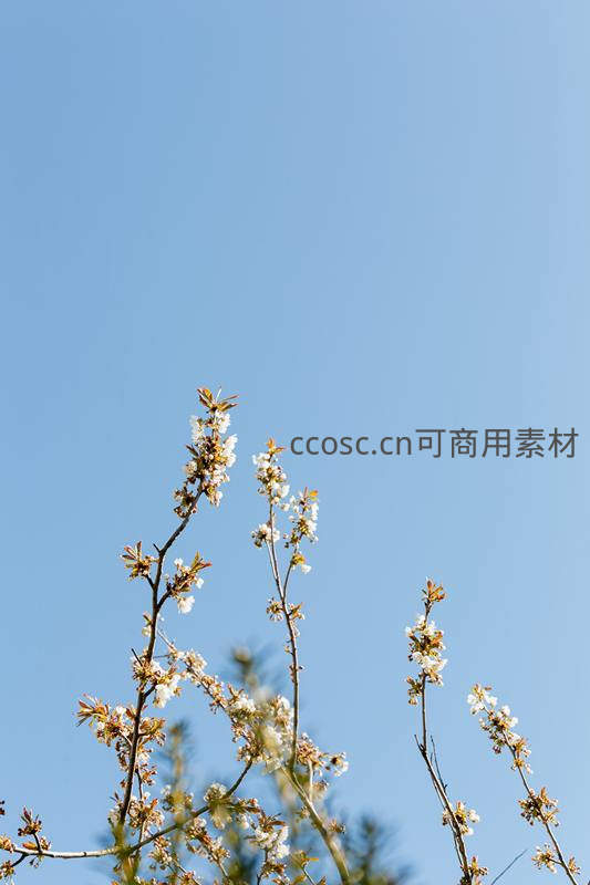 从低角度仰望,几枝开满白色小花的樱花树伸向广阔无垠的蔚蓝天空,构图简洁而富有诗意,充满春日气息。