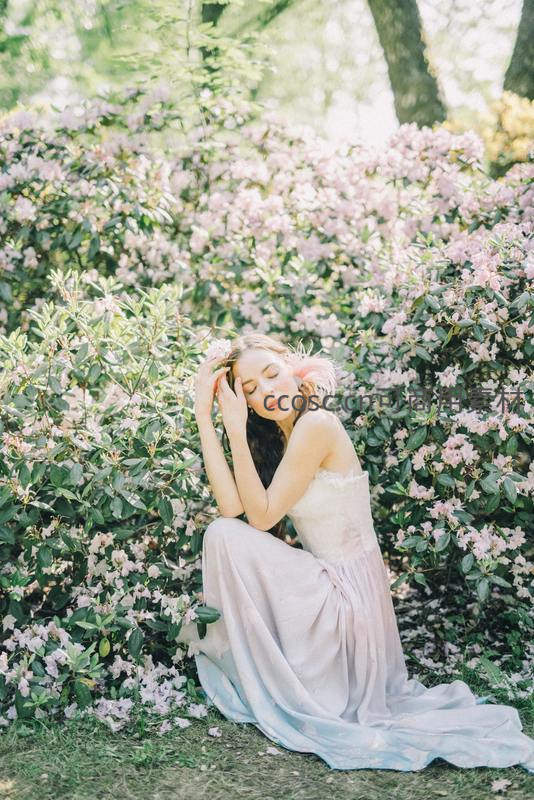 一位身穿淡色长裙的少女闭目倚靠在粉色杜鹃花丛旁,享受阳光与花香,画面宁静而浪漫。