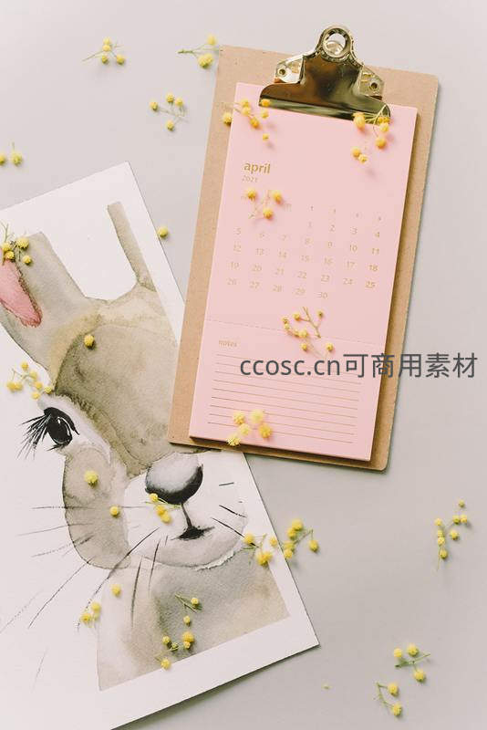 一张粉色四月日历夹在棕色板夹上,旁边是水彩画的兔子头像,散落的黄色小花点缀其间,整体画面温馨雅致,充满春天气息。