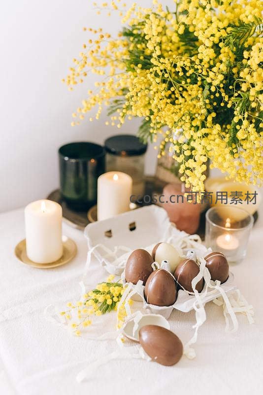 白色桌布上摆放着装满巧克力蛋的纸托,背景是茂盛的黄色含羞草和点燃的蜡烛,营造出温馨浪漫的复活节庆祝氛围。