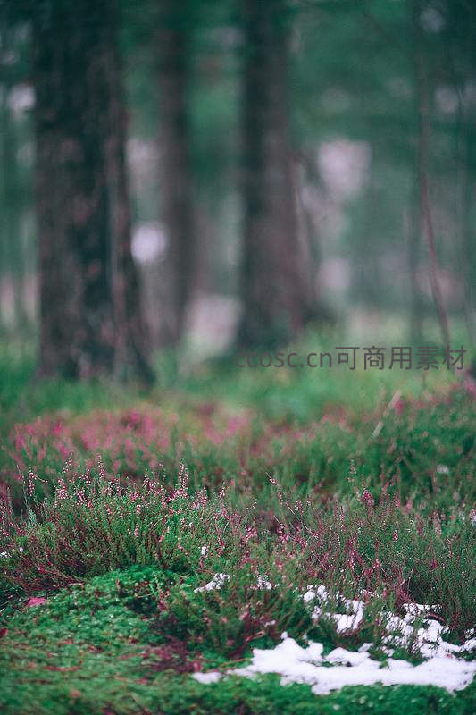 幽静的森林中,翠绿的苔藓铺满地面,点缀着粉红色的小花和未融的白雪,营造出一种清新而宁静的早春氛围。