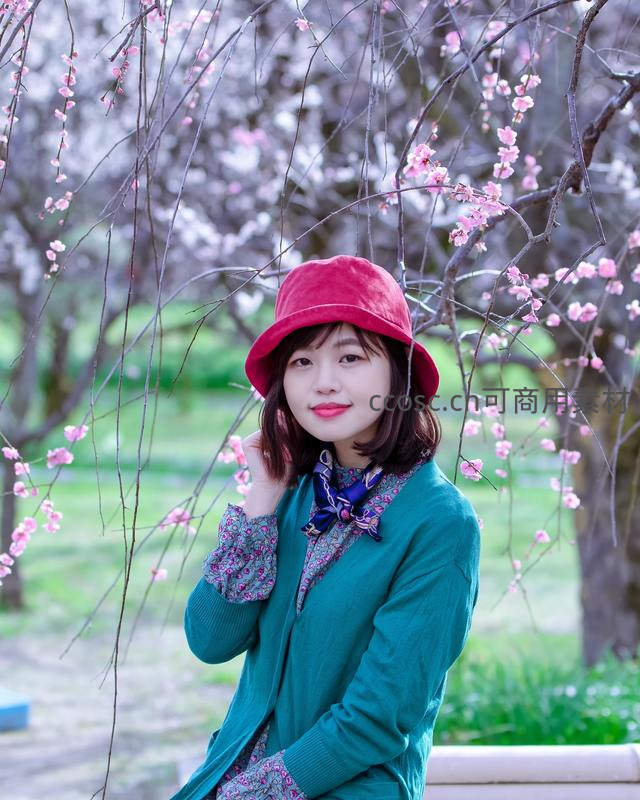 一位戴着红色渔夫帽的年轻女子站在垂枝梅花下,面带甜美微笑望向镜头,身着蓝绿外套与碎花内搭,背景粉嫩花枝衬托出盎然春意。