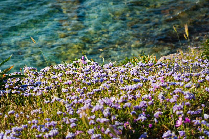 紫色野花簇拥海岸,碧水轻漾映春光