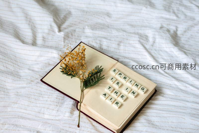 白色条纹床单上,一本打开的书静静躺着,书页上是“SPRING IS IN THE AIR”的字母方块,搭配一枝金黄含羞草,整体画面简洁而富有诗意。