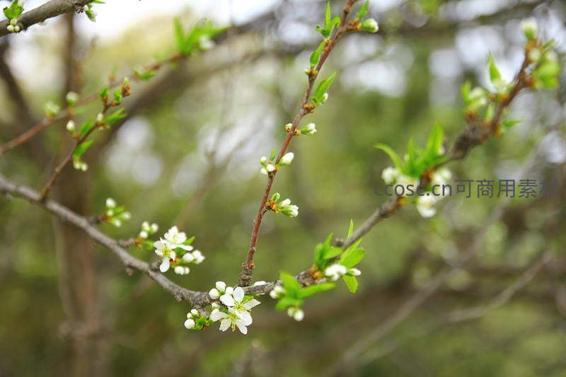 镜头聚焦于初春枝头绽放的小白花,花瓣细腻,嫩叶相伴,背景虚化突出主体,展现生命萌动的细腻之美。