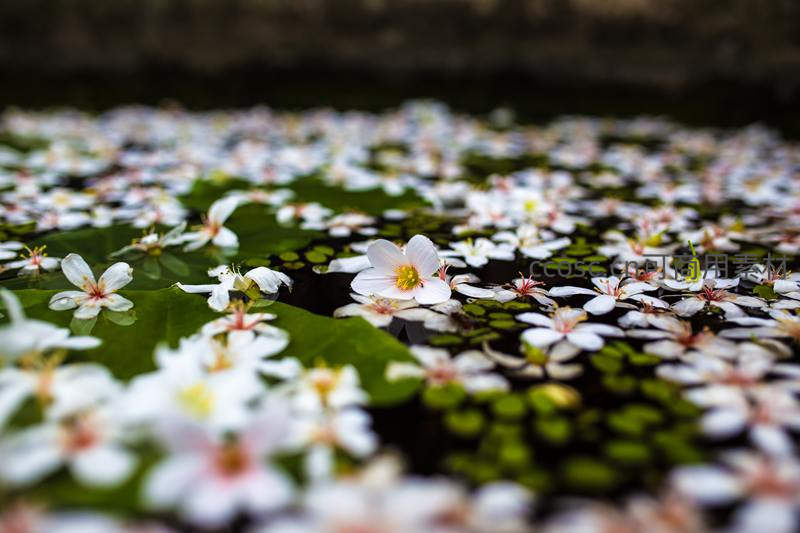 微距镜头捕捉到池塘水面上漂浮的洁白花朵,花瓣轻盈散落,与碧绿的叶片相映成趣,水面倒影朦胧,展现自然生态的细腻之美。
