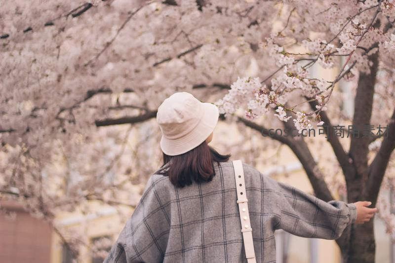 女孩背影轻触樱花枝头漫步