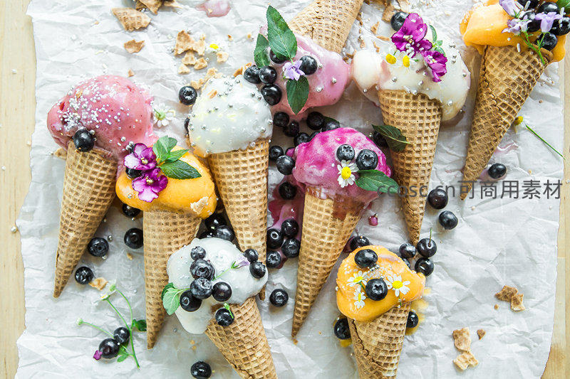 多种口味的冰淇淋球盛放在脆皮甜筒中,顶部精心装饰着新鲜蓝莓、可食用小花和糖珠,摆放在褶皱的烘焙纸上,视觉效果甜美诱人。