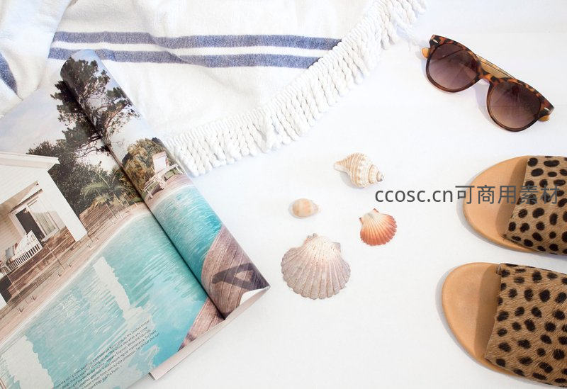 沙滩风情:贝壳、墨镜与度假杂志的惬意时光