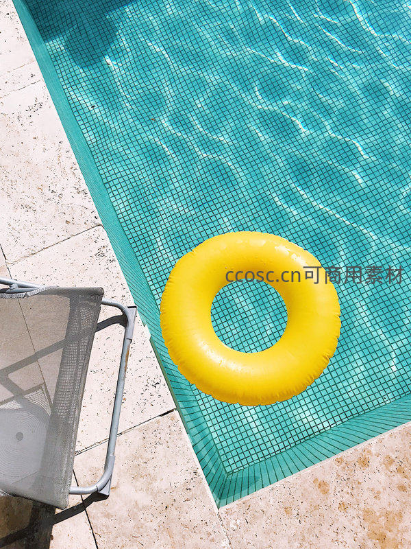 泳池一角:黄色泳圈与躺椅的夏日休闲场景