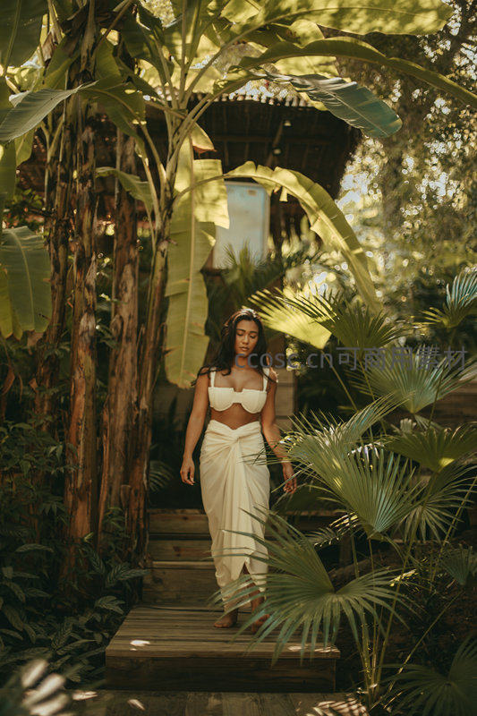 在茂密的热带植物环绕中,一位女子身穿白色裹身长裙和比基尼上衣,沿着木质小径缓步前行。阳光透过宽大的芭蕉叶洒下斑驳光影,营造出静谧的度假氛围。