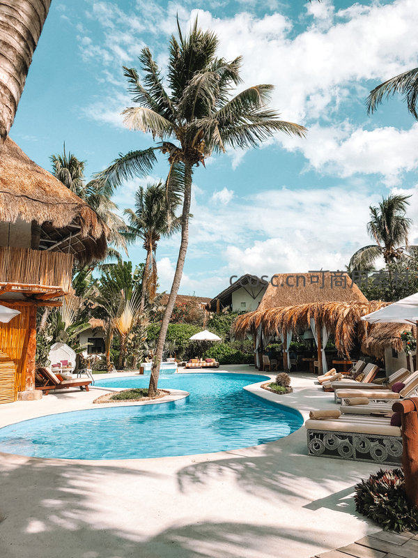 清澈的泳池蜿蜒于棕榈树与茅草屋之间,蓝天白云下尽显热带风情,是放松身心的理想度假胜地。