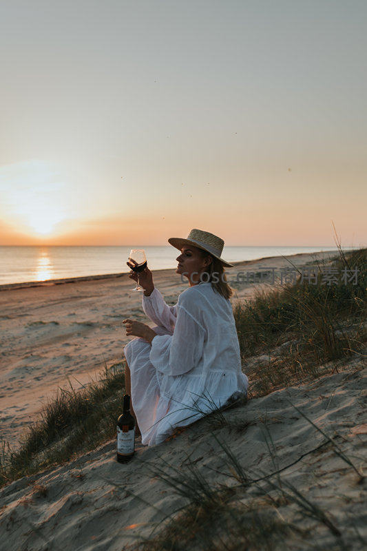 夕阳西下,一位女士坐在沙滩上,手持红酒杯静静欣赏海天一色,氛围宁静而浪漫,充满诗意。