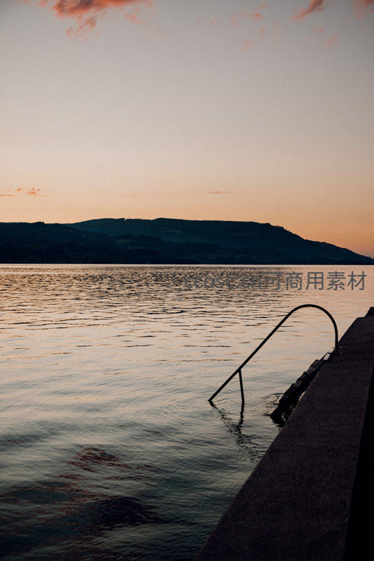 湖畔黄昏的金属梯与远山