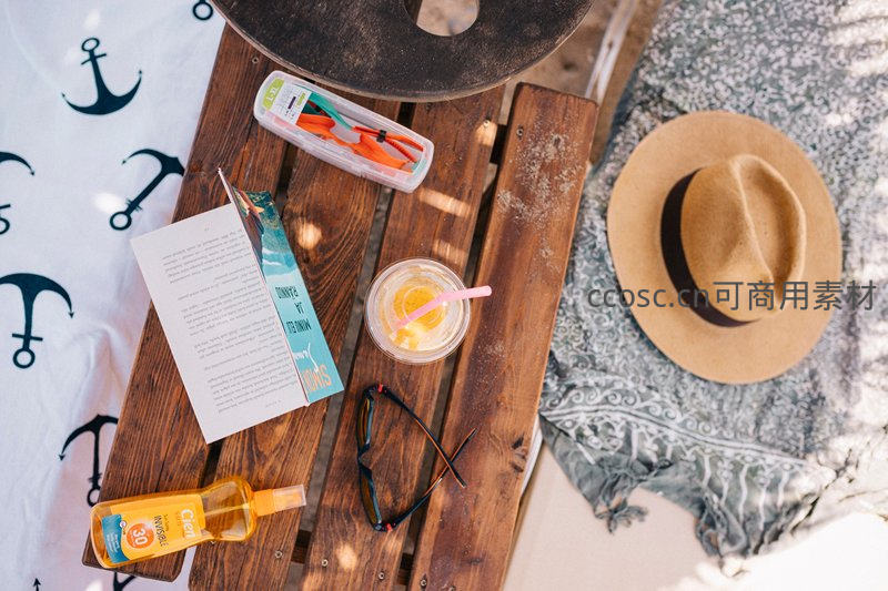 一张木质桌上摆放着防晒霜、冰饮、墨镜、草帽和一本打开的书,旁边铺着印有锚图案的沙滩巾,营造出轻松惬意的夏日海边度假氛围。