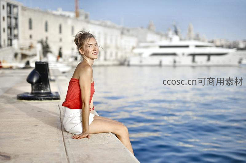 一位年轻女子身着红白搭配的夏装,坐在码头边缘,面带微笑回眸,身后是蔚蓝海水与停泊的游艇,展现轻松愉悦的度假风情和都市滨海魅力。