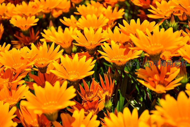 镜头聚焦于一片密集盛开的橙黄色雏菊,花瓣在阳光下熠熠生辉,展现出蓬勃的生命力和温暖明媚的春日氛围。