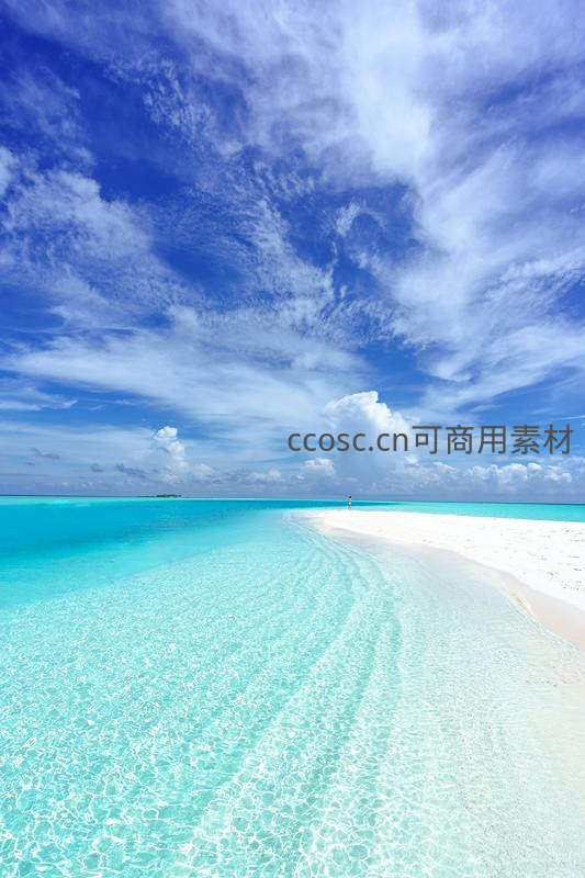 一条洁白细腻的沙滩如丝带般延伸入无垠的碧海,头顶是变幻的云朵与深邃的蓝天,尽显原始海岛的纯净与壮美。
