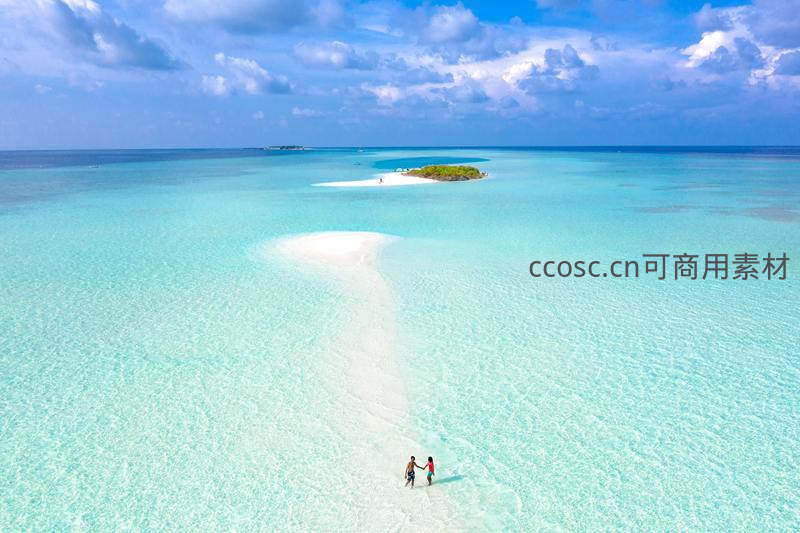 从高空俯瞰,一对情侣手牵手走在连接小岛的白色沙洲上,四周是晶莹剔透的浅蓝色海水,画面充满爱与自由的气息。