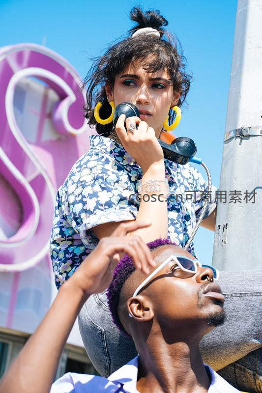 一对时尚情侣在晴朗的街头互动,女子手持复古电话听筒,男子仰头凝视,背景是巨大的粉色字母标志,整体画面充满青春活力与都市潮流感。
