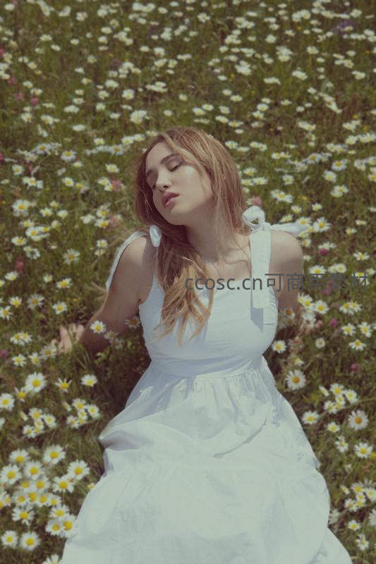 白裙少女静卧雏菊花海闭目享受自然