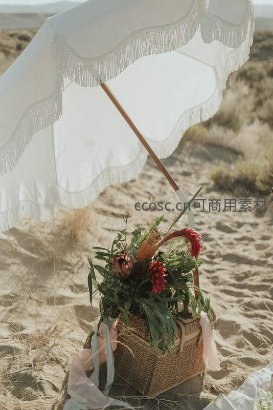 白色流苏遮阳伞下,藤编野餐篮盛满鲜艳花卉与绿植,置于细腻沙地上,营造出温柔浪漫的海滨野餐场景,充满仪式感。