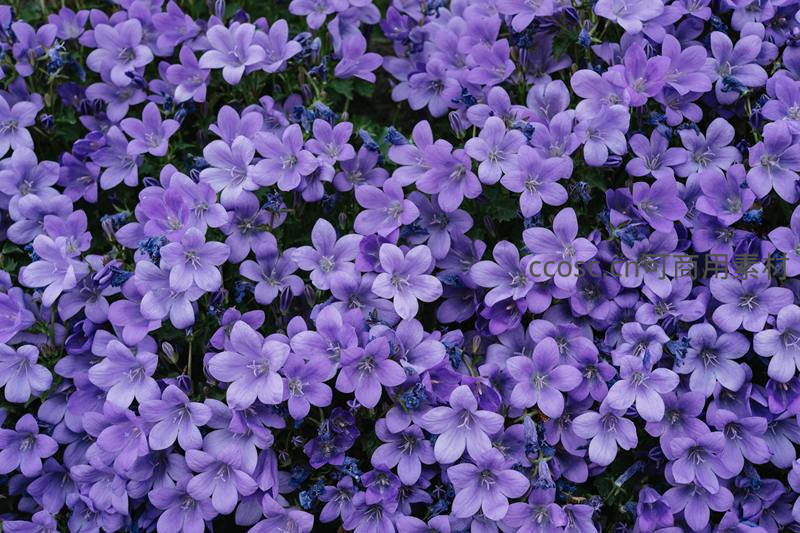 大片紫色风铃草密集盛开,花瓣轻盈如铃,绿叶点缀其间,在柔和光线下营造出梦幻般的自然景致,充满生机与诗意。