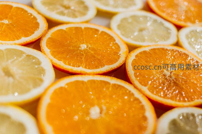新鲜橙子柠檬切片特写,果肉饱满多汁