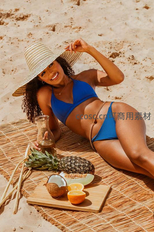 黑人女性身着蓝色比基尼,头戴草帽躺在沙滩垫上,身旁摆放新鲜菠萝、椰子与橙子,笑容灿烂,充满夏日海滩的轻松与活力。