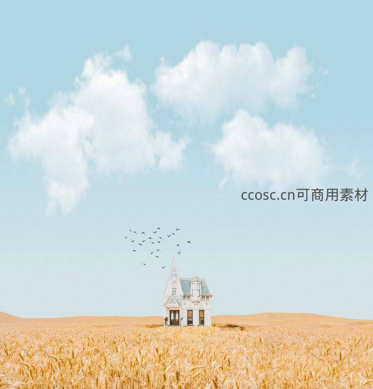 一座白色尖顶小屋静立于无垠的金色麦浪之中,头顶是澄澈的蓝天与蓬松的白云,几只飞鸟掠过天际,构成一幅宁静而梦幻的田园画卷。