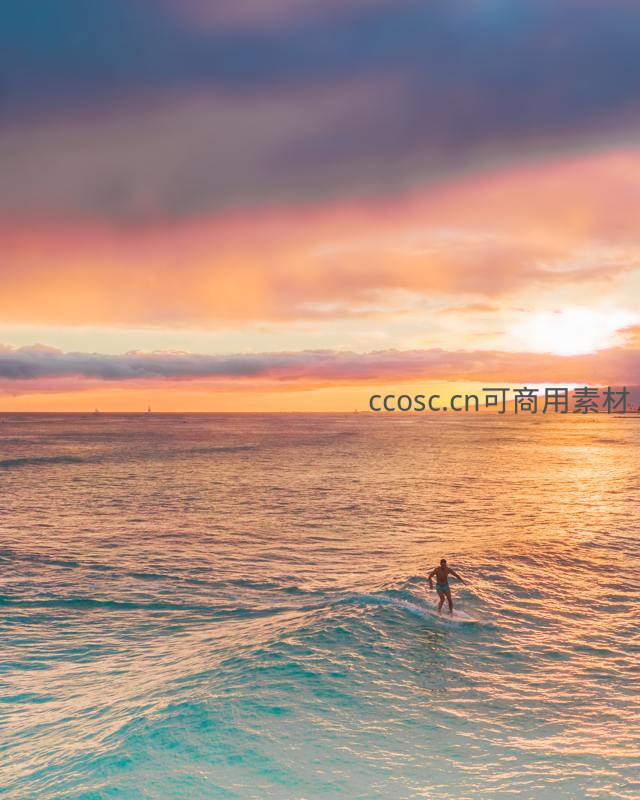 一名冲浪者在绚烂的晚霞下乘风破浪,金色阳光洒满海面,远处山峦与云层交织,构成一幅壮丽的自然画卷。