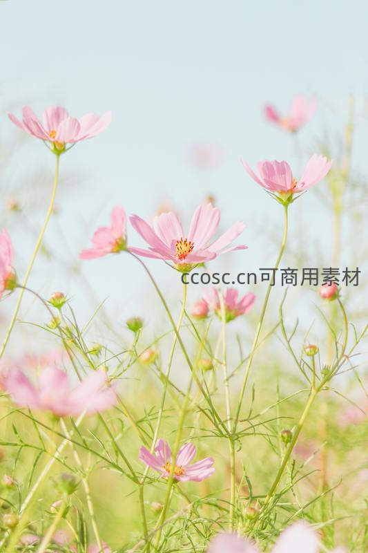 微风中粉色波斯菊轻轻摇曳,纤细花茎托起娇嫩花瓣,背景虚化营造梦幻感,传递春日浪漫与大自然的温柔生命力。